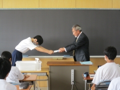 阿部自治会長は、14歳という考え方がまだまだ柔軟なうちに、いろいろな哲学・人生観に触れてほしいという思いで、今回の贈呈にいたった思いを語っていただきました。