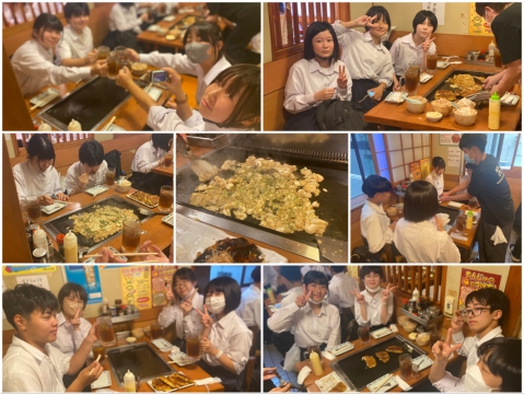 5分前行動をしっかり守って分散を終え、夕食のもんじゃ屋さんへ。歩数計はすでに15,000歩を超えていますが、そんなこと微塵も感じさせない元気な生徒たちです。初めてのもんじゃ焼きも器用に焼いて味わっています。