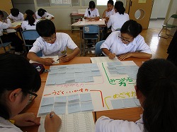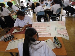 昨日と今日の6時間目に1年生はキャリア学習をしました。「社会生活・仕事で必要な力」を個人、グループ、クラスで考えました。その後、自分たちで考えた必要な力を自己評価し、これから社会に出るにあたって、どのような力をつけていくべきなのかを考えました。