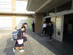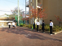 本日、明日と朝の挨拶運動を行います。生徒会中心に専門委員長・学級委員が南門と西門、生徒昇降口に立って「おはようございます」と登校した生徒に声をかけていました。秋の澄んだ空気の中、あいさつをかけあう声が校庭に響いていました。