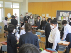 本年度より、コミュニティスクールに加わっていただいた2名の委員に代表して委嘱状を受け取っていただきました。また、各学年の授業の様子を見ていただき、小規模校の在り方やメリットなど、今後の橋北中学校について貴重な意見をいただきました。