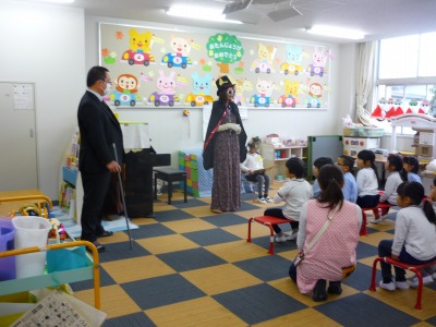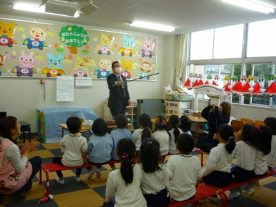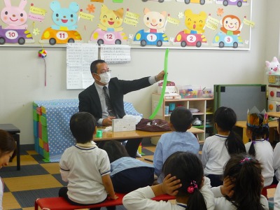 本校に併設している橋北幼稚園のお誕生会で,教頭先生が「でんじろう先生」になって手品を披露しました。「静電気」の性質やシールはがしの「物を溶かす性質」を利用して手品を披露すると,園児たちは興味深々で食い入るように見つめていました。中学校教員の教科性を利用して,このような交流を毎年何回か行っています。いろいろなことに興味を持つきっかけになってくれるといいなと思います。