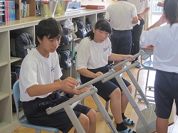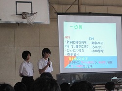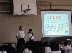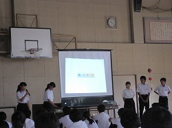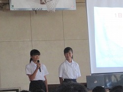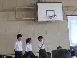 次に、全校集会で各学年の代表者が1学期の取り組みについて発表を行いました。1年生は自然教室、2年生は職業体験、3年生は修学旅行について発表していました。