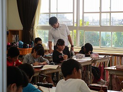 橋北中学校区では、小学校の算数と英語の授業に中学校の先生が乗り入れる取り組みを行っています。今日は、数学教師が、5年生と6年生の算数の授業に入りました。小学生は、興味深げに授業を受けていました。