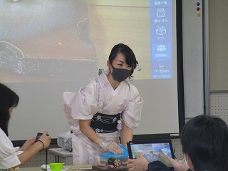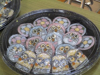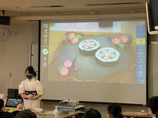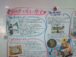 本日本校のコミュニティスクール委員で、「飾り巻きずしマスターインストラクター」の花村明日香さんをゲストティーチャーに招きました。2年生英語の教科書で紹介されている「飾り巻きずし」つくりの実演をしていただきました。
