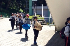 出発式 快晴の中〜仲間と協力し自然とともに学び合おう〜をテーマに自然教室が始まりました。