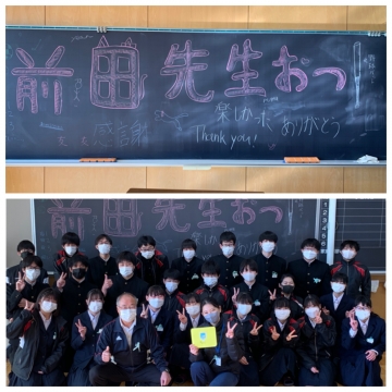 前田先生は今年、教職最後の年でした。3年生から感謝のサプライズを贈りました!3年生のみんなは、前田先生にとって記念すべき最後の担当学年の生徒ということになります。前田先生のダジャレサイコーです!