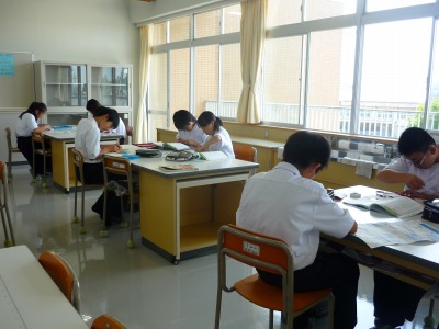 3年A組は音楽の授業で合唱コンクールの曲のパート練習をしていました。男女の数がアンバランスで,女声パートのソプラノは3人,アルトは2人ですが,頑張って練習していました。男声パートも初めてとは思えないほどよく声が出ていました。11月1日の本番が楽しみです。