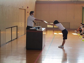 1学期の終業式の時にも紹介しましたが、3年生 内山 佳奈子さんの「2020年度 中学生海の絵画コンクール」の賞状や盾、その他賞品が学校に届けられていましたので、全校生徒の前であらためて表彰をしました。