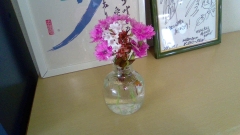 園芸創作部で花を生けました。校庭に咲いている草花を、みなさんに楽しんでもらうために毎回工夫していけています。みなさんのちょっとした癒しになると嬉しいです。