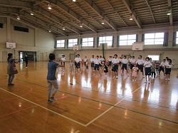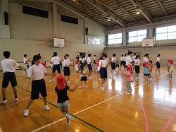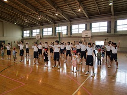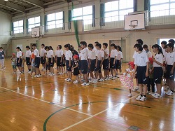 本日、こども園の園児が来校し、体育祭の練習を3年生と一緒に行いました。
