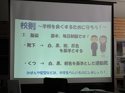 昨日は、大雪のため休校となりました。本日もぱらぱらと雪が降っている状況で、とても寒い1日です。そのなかで、1年生は技術の時間にパワーポイントの発表会がありました。内容は「新入生に向けての学校紹介」です。どの班も学校のことについてよく考えてわかりやすいスライドを作ることができました。発表の仕方も工夫しながらできました。改善するべきところもあったと思うので、直してわかりやすい発表にしていきましょう。