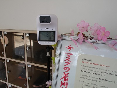 早速、来客用玄関に設置させていただきましたので、皆さまも橋北中へお越しの際は、こちらのほうでの検温とアルコールによる手消毒にご協力ください。