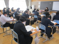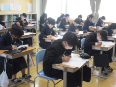 3年生は、国語、数学、英語の3教科のテストでしたが、全力で取り組んでいました。わからなかったところや自信のないところもあったようですが、テスト後、すぐにでも克服できるように復習しましょう。