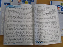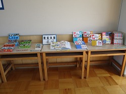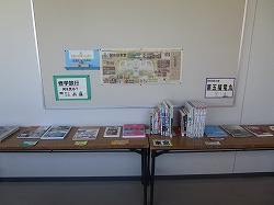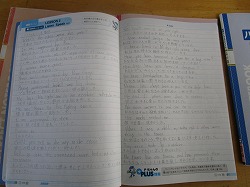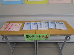 生徒昇降口に続く廊下に「英語ノートの見本」と題して、先輩たちの英語ノートが展示してあります。英語の勉強の仕方がわからない人には参考になります。まだ、見てない人は是非、手に取ってみてください。他にも2階の相談室前には、修学旅行に関係する本が置いてあります。また、3階のオープンスペースには、職業体験に関係する本が置いてあります。これからも、行事や時期に応じた展示をしていきたいと考えています。