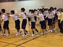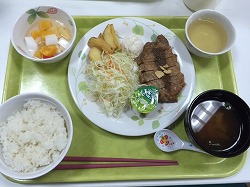 夕食はトンテキ定食でした。昼食の時間が早かったので、たくさんの生徒がお代わりをしていました。