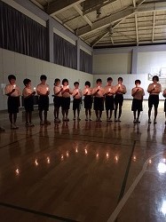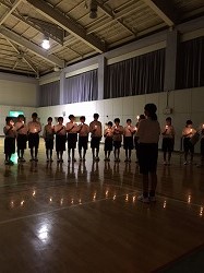 その後は楽しみにしていたキャンドルファイヤーです。営火長から代表、そして一人一人のロウソクに火が灯され、班長が誓いの言葉を言いました。幻想的な雰囲気の中、学年36人の友情と絆を誓いました。