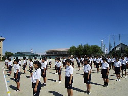 昨日までの雨とは変わり,非常に良い天気のなか体育祭練習を行うことができました。本日は,行進・ラジオ体操を入念に行いました。そのあと,グループ種目の練習をしました。初めての練習だったので,戸惑うことも多かったですが,やっていくうちに少しずつレベルアップしていました。次に,全員リレーを行いました。バトンパスがうまくいかないところも多く,どのチームもこれからの練習次第でどこが優勝するかわかりません。この土日は体を休めて来週からもがんばりましょう!