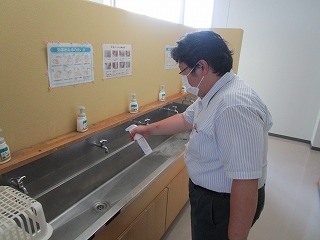 本日は24日(月)からの2学期に備え、職員が手分けして校舎内の消毒作業を行いました。