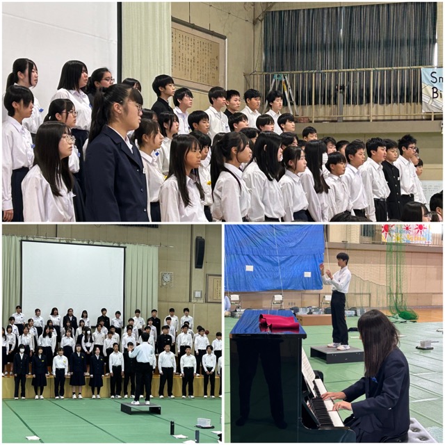 今日は全校合唱の練習をしています。普段の学級合唱とはまた違い、立ち位置や体の向き、声のバランスや言葉のそろえ方等、音楽科の先生からは色々な指示がとびます。