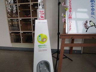来客用玄関に設置しましたので、今後も引き続き、来校時の手消毒にご協力ください。