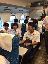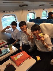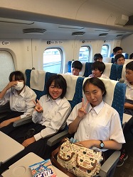 号車は川越中学校と一緒です。あいにくの天気なので、富士山は見えそうにないですが、おやつを食べたり、トランプをしたり楽しんでいます。