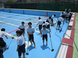今日は期末テスト3日目でした。その後、3限目には1年生が、4限目には3年生がこれからのプールの授業に向けて掃除を行いました。