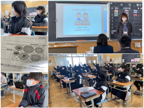 今日は羽津北小学校の栄養教諭・宮下先生が食育の授業をしに来てくれました。2年生では、「成長期の食生活について」というタイトルで、成長期にどうして適切な食事が必要なのかなどを具体的な例を示しながら教えていただきました。