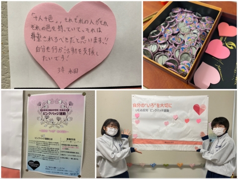 カナダの学生から世界的ムーブメントとなっていじめ反対の意思表示となっているピンクシャツ運動。本校では、生徒会がオリジナルピンクバッジを製作して配付し、生徒の意思表示としています。さらに今年は生徒会の新たな試みとして「いじめ反対の気持ちが見える」ように、ハート型の付箋に自分の思いを記して掲示した人からバッチを配付していますす。温かい言葉が並ぶハート付箋、読んでいると元気をもらえますよ。