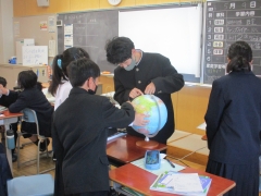 1年生の地理の授業で、地図帳と地球儀を使いながら、イギリス(ロンドン)とケニア(ナイロビ)のどちらが近いか予想して、実際に調べました。また、日本から東へ進めとどこへたどり着くか予想、ほとんどの生徒がアメリカ合衆国…、のはずでしたが、実際に紙テープを使って地球で調べると、ブラジルにたどりつく。なんで?どうして?子どもたちから、疑問がわいてくる内容でした。