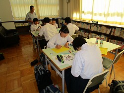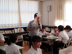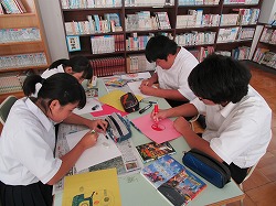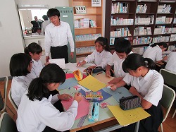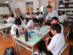 本日の放課後、地区社協体育部の方から依頼を受けた地区運動会で行う幼児対象の種目「旗取り」の旗を3年生有志17名で作成しました。地区の担当の方から説明を受けて、それぞれが流れ作業で旗を作成していきました。今回の旗は、風車が付き、3年生から幼児へのメッセージが付き、そして旗にはイラストが描かれているという手作り感一杯の旗です。生徒たちは1本1本丁寧に、そして運動会で頑張る幼児の姿を思い描きながらメッセージとイラストを描いていました。