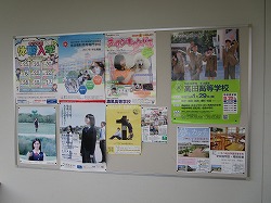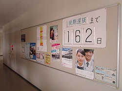 今、3年生の廊下の掲示板では、進路関係のポスターがたくさん貼られています。今週から「後期選抜まで後〇〇〇日」とカウントダウンカレンダーが貼りだされました。また、高校体験入学の感想も冊子にまとめられ置いてあります。資料で調べたり、体験入学に参加したりして、自分に合った進路選択をしていって欲しいです。