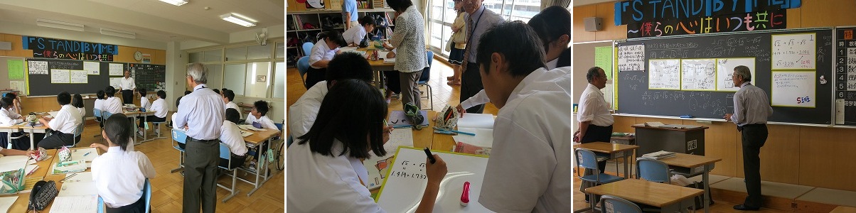 6月17日(水)、四日市市教育委員会より教育アドバイザーの先生にお越しいただき、3年生数学の授業を参観していただきました。根号を含む式の和について、例題をもとに式が正しく成立するかどうか班で話し合いました。生徒たちはホワイトボードを活用しながら一生懸命考えていました。その後、授業についてのアドバイスをいただきました。