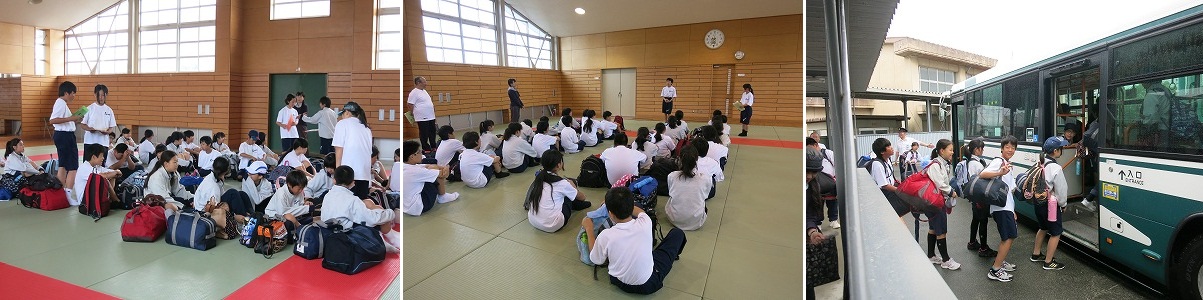 6月3日(水)、朝から大きな荷物を持って登校し、武道場にて自然教室の出発式を行いました。荷物の確認をし、実行委員より自然教室に向けての挨拶がありました。あいにくの雨で、予定していた内容も変更になりますが、健康に留意して、三日間の自然教室を通して仲間との絆をさらに深めてほしいと思います。