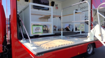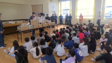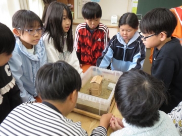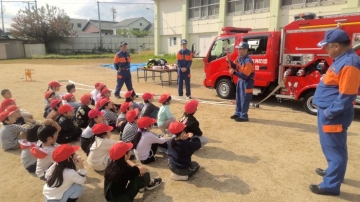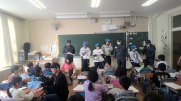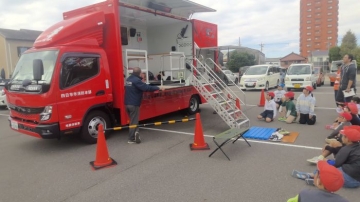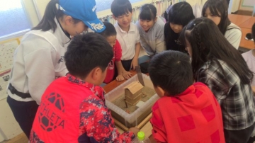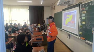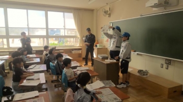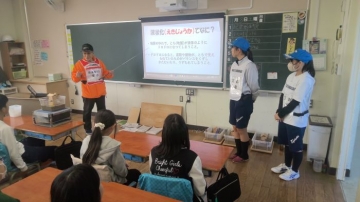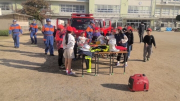 1限目 橋北分団の仕事学習 2限目 液状化実験 3限目 起震車見学 4限目備蓄品について