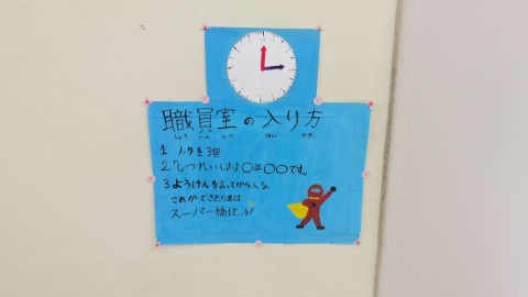 5年生が、図工の制作活動で学校内での教室表示表など看板づくりを行いました。どれも力作ぞろいで、よく考えてあると思いました。