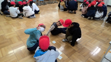 どの教室でも、1年~6年まででグループを作り、みんな真剣にけがのてあてについて考えていました。