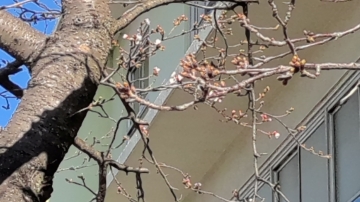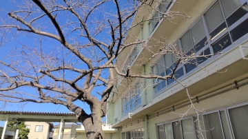本日、体育館横の桜の木で7輪ほどのさくらの開花が認められました。校舎改築のため、来年でこの桜も見納めとなります。どうか満開の桜がみられますように!