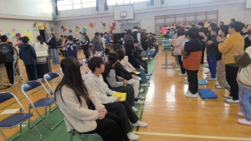 2限目。まずは5年生が「威風堂々」を合奏する中、6年生が入場しました。司会者が6年生一人一人の名前を呼び、6年生からの言葉を紹介しました。