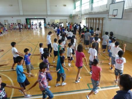 7月18日、全校で大四日市まつり音頭を踊りました。盆踊りと聞くと思い出す懐かしいメロディーです。子どものころよく踊ったものです。今の子どもたちはどうでしょうか。全校児童で円になり、音楽に合わせて楽しく踊ることができました。 |