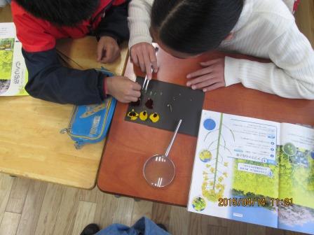 理科で「花のつくり」について学習しました。パンジーの花の一つ一つを丁寧に優しくはずしていきました。「がく」をはずし、「おしべ」「めしべ」へと進んでいきました。とっても小さくて細かい「おしべ」や「めしべ」をはずすことができました。理科では、「乗り入れ授業」といって、中学校と連携し、中学校の理科の先生に授業に参加していただき、より専門的な知識を学ぶことができるような学習体制をとっています。