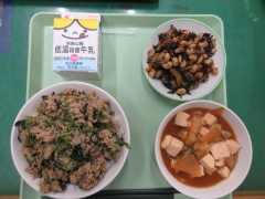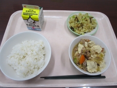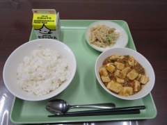 今日の給食は、「米飯・牛乳・マーボー飯・バンバンジーサラダ」です。4日火曜日に続き、今日は大豆から作られている豆腐です。豆腐は大豆をそのまま食べるより、大豆の栄養が体に吸収されやくすなっています。美味しくいただきました。ごちそうさまでした。