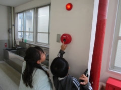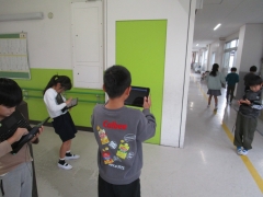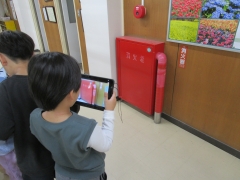 3年生は、社会科の学習の一環として、校内の消防設備について調べています。校内の消防設備を見つけ、タブレットにある校舎配置図で確認しながら写真を撮り、調べ学習を進めていました。