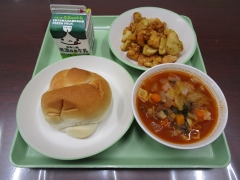 今日の給食は、「米粉パン・牛乳・ハニーマスタードチキン・ミネストローネ」です。給食のハニーマスタードチキンは、はちみつと粒マスタード、酒、砂糖、しょう油、レモン汁を合わせたソースで、鶏肉とじゃがいもを混ぜ合わせてあり、美味しくいただきました。ごちそうさまでした。