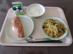 今日の給食は、「小型玄米パン・牛乳・和風きのこスパゲッティ・りんご入りヨーグルト」です。今日のヨーグルトには、いちょう切りしたりんごと、すりおろしたりんごが混ぜてあり、旬の味覚を美味しくいただきました。ごちそうさまでした。