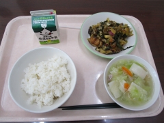 今日の給食は、「米飯・牛乳・肉豆腐・はりはり漬」です。鍋料理でおなじみの肉豆腐、豚肉や野菜もたっぷり入っていて栄養満点で体も温かくなります。美味しくいただきました。ごちそうさまでした。