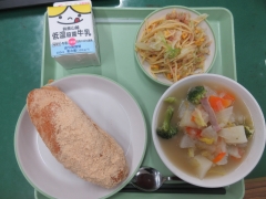 今日の給食は、「きなこあげパン・牛乳・ポトフ・スパゲッティサラダ」です。今日は大人気のあげパンです。今日のあげパンには大豆から作られている「きなこ」と砂糖がまぶしてありました。さすがの人気メニュー、美味しくいただきました。ごちそうさまでした。