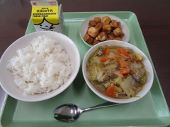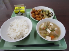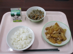 今日の給食は、「米飯・牛乳・鶏肉の照り煮・ごぼうの中華きんぴら」です。平安時代には野菜として食べられるようになったごぼう、ごぼうの食物繊維は、おなかの調子を整えたり、腎臓や血液の働きをよくしてくれる働きがあります。美味しくいただきました。ごちそうさまでした。