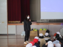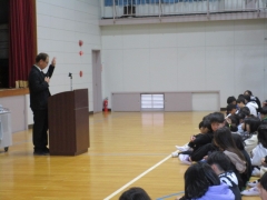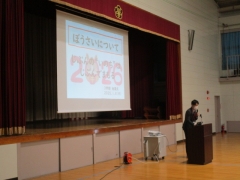 最後に、防災担当の教職員から、避難訓練の意義と正しい避難の方法についてスライドを用いながら説明し、学習の場としました。