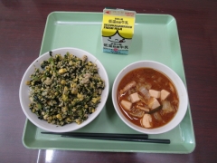 今日の給食は、「キムタク丼・牛乳・ツナともやしのあえもの・わかめと卵のスープ」です。今日の献立は長野県の給食献立です。長野県塩尻市に「キムタクごはん」という人気のきゅうしょくメニューがあります。「キムチ」と「たくあん」を豚肉などといっしょに炒めてごはんに混ぜ込んだ料理です。漬物が苦手な子でもおいしく食べられるようにと開発された「キムタクごはん」の具をごはんにのせた「キムタク丼」、美味しくいただきました。ごちそうさまでした。